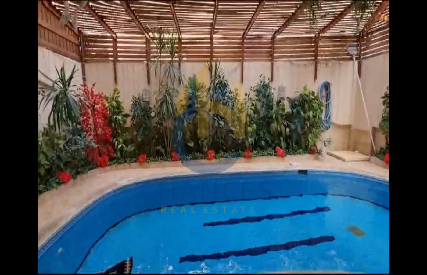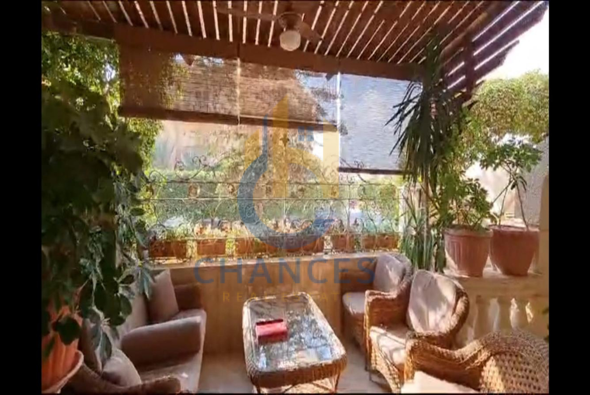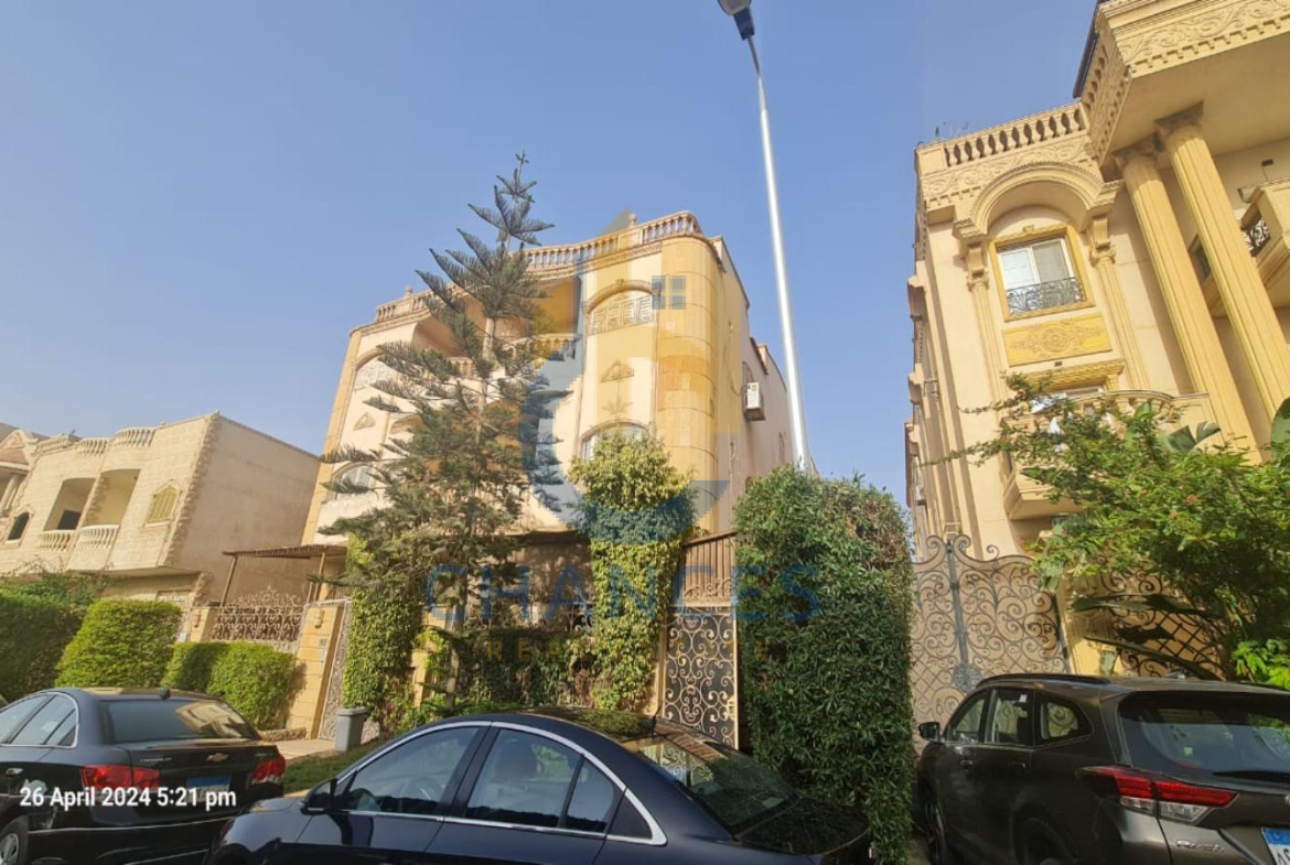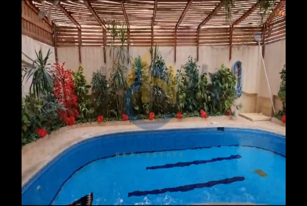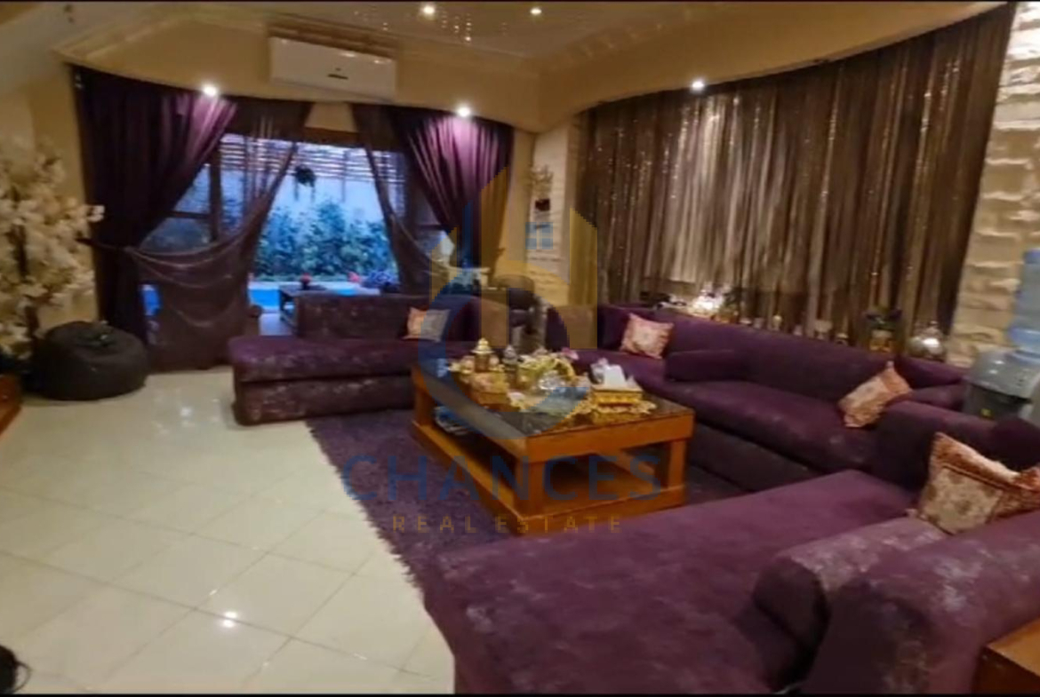 الدور الارضي مكون من ٢ ريسبشن و سفره و مطبخ امريكاني و تراس خلفي مع حمام سباحه بالجنينه مغطي بالكامل وتراس امامي مطل علي الشارع ومربع جنينه