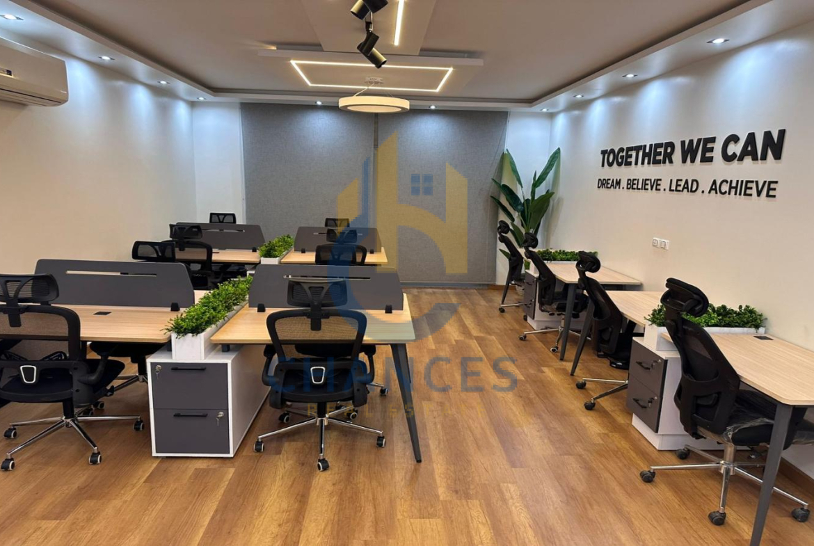 مجهز ومفروش بالكامل بالتكيفات – ريسيبشن للاستقبال – مطبخ مجهز – مساحة عمل مشتركه تحتوي على عدد 13 مكتب منهم مكتب منفصل